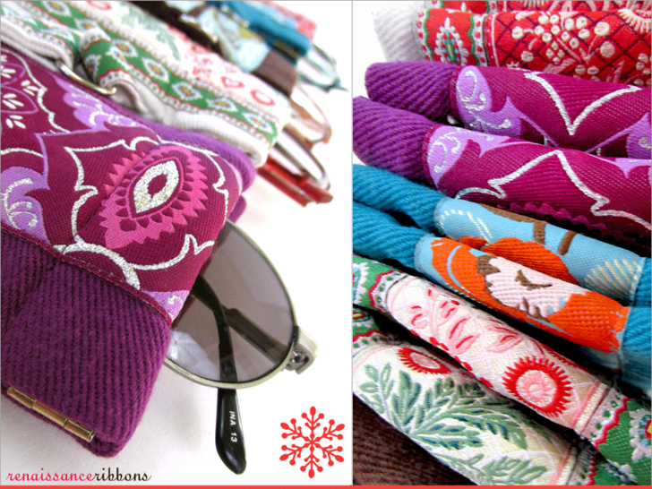 These easy-open eyeglass cases are embellished with a variety of gorgeous ribbons from Renaissance Ribbons, including favorite designers: Amy Butler, Anna Maria Horner, Dena Designs and French General… just a few of the amazing creatives who trust Renaissance Ribbons to execute their work in woven ribbon. Our cases have a soft fleece lining to protect your lenses. And, an internal flex frame makes them easy to open and shut with just one hand.