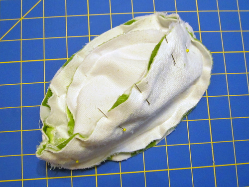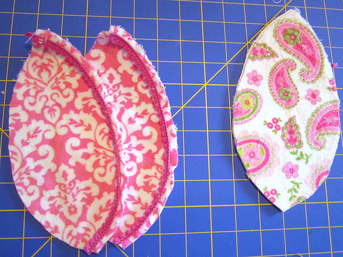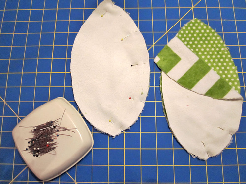 - Find the four chosen wedges of one egg. Split them into coordinating pairs. Place the two wedge pairs right sides together. Pin each pair together along one curved edge.