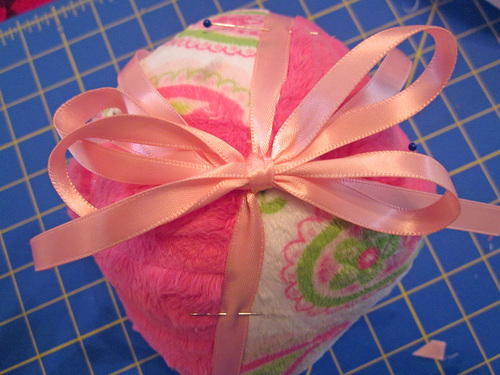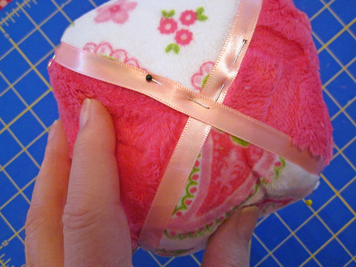 - Bring the ribbon ends up and over the egg to meet at the top, following the seam lines with the ribbon. Pin the ribbons in place. Tie at bow at the top of the egg.