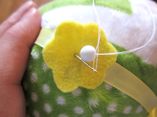 - Hand stitch felt flowers along each seam. The flowers are a pretty accent and secure the ribbon in place. We used a single bead for the center of each flower. Our sample eggs have three small flowers along each ribbon.