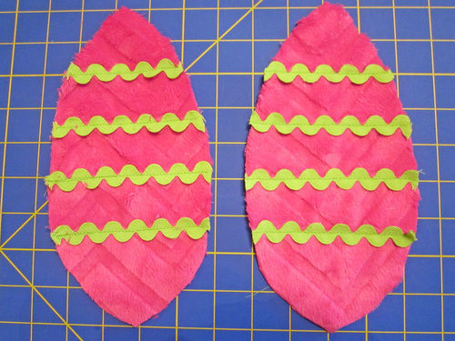 - Cut four lengths of rick rack to fit across both wedges (approximately 14″, but measure on your placement lines to insure the length is correct) .