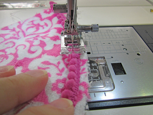 - Cut two additional lengths of mini pom trim. Machine baste a length to each outer raw edge of ONE sewn pair, leaving the outer raw edges of the other sewn pair plain.