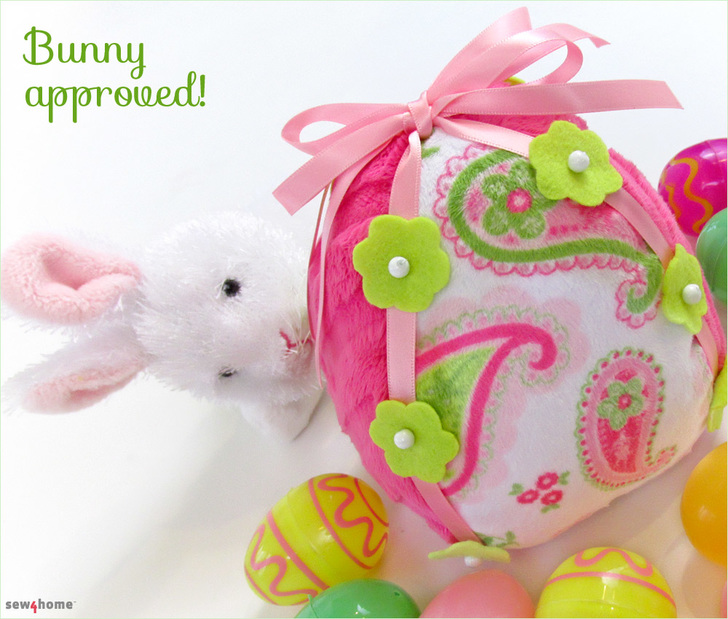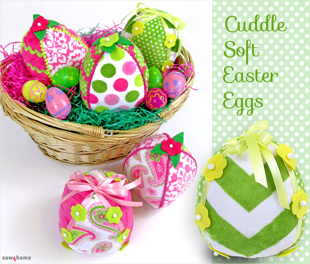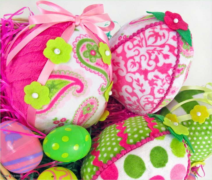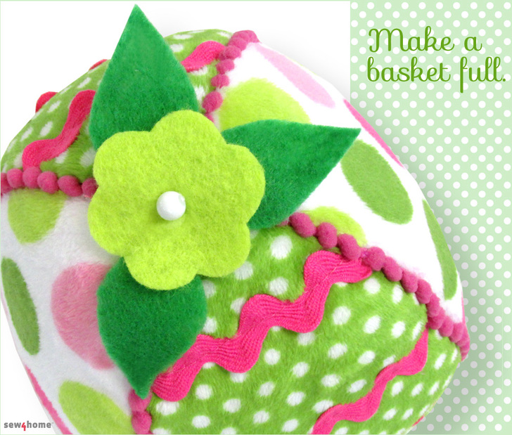 The practice of decorating eggshells goes back much farther than the Christian traditions surrounding Easter. 60,000-year-old ostrich eggs with engraved decoration have been found in Africa. The ancient Egyptians, Persians, Phoenicians, and Hindus all believed the world began with an enormous egg, so using the egg as a symbol of new life is literally ancient history. We’ve put aside the marbled elegance and gold leaf of long ago, as well as the today’s candy-colored dyes and crayons, opting instead for a basket of super-soft decorative eggs in bright, patterned fleece with ribbons, rick rack, mini-poms, and felt flower accents. They probably won’t last 60,000 years, but they sure are cute right now!
