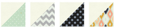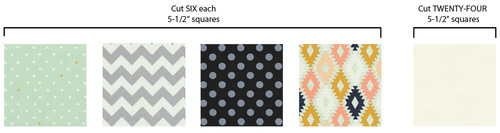 NOTE: If you are working with any directional prints, as we were with our chevron and diamond prints, you will want to carefully fussy cut your strips to center the motif in the correct direction. For example, all our directionals were fussy cut on the horizontal. - Sub-cut each strip into SIX 5½” squares for a total of SIX squares from each of the four prints – 24 squares total.