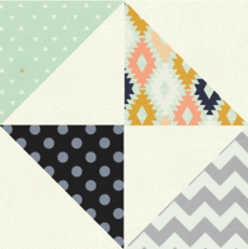 - Arrange the four half square triangles into a four square block as shown below. It is extremely important that each block is configured exactly as shown. The twelve blocks should look identical to one another.