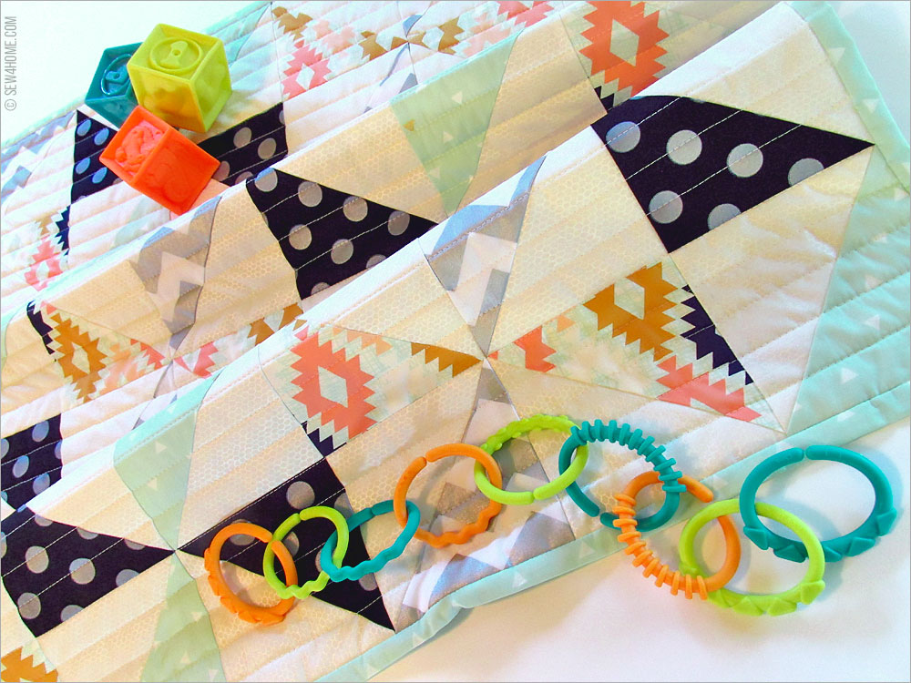 - ¾ yard of 44″+ wide quilting cotton in ONE additional coordinating PRINT for the quilt top patchwork and the binding; we originally used Arizona Triangle Tokens by Riley Blake Fabrics