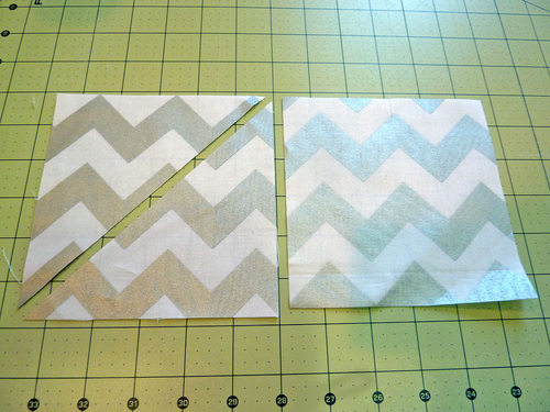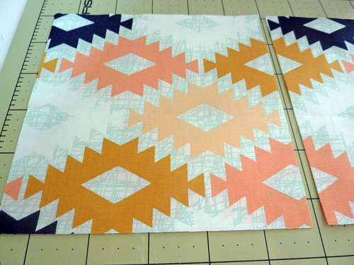 - Cut them all on the diagonal (you can stack and cut or cut individually). To insure the motifs maintain the proper direction for each block, make all cuts from the bottom left to the upper right.