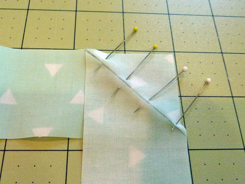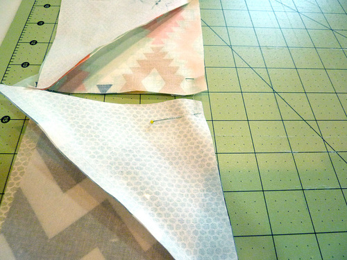 - Place the two triangles right sides together and pin along the center diagonal line.