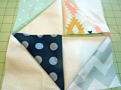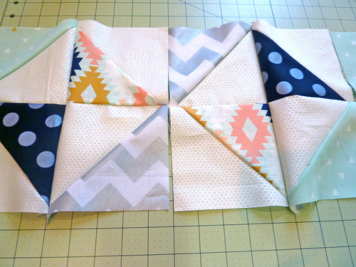 - Pull one of each of the four different half square triangles to create twelve sets of four.