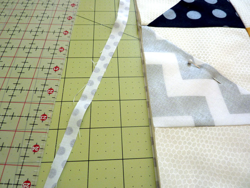 - From the remaining print fabric that will also be used for the binding (Arizona Triangle Tokens in our sample), cut FOUR 2″ x WOF (width of fabric) strips.