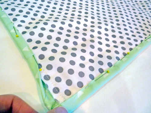 - Bring the folded edge over onto the quilt back. It should just cover the seam line. Pin in place all around, making a pretty miter at each corner.