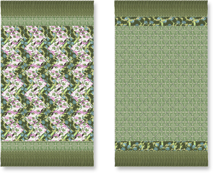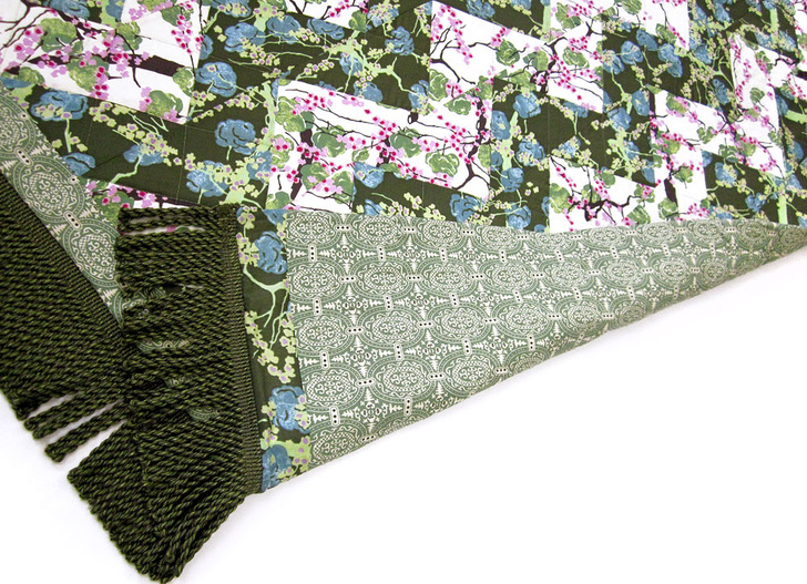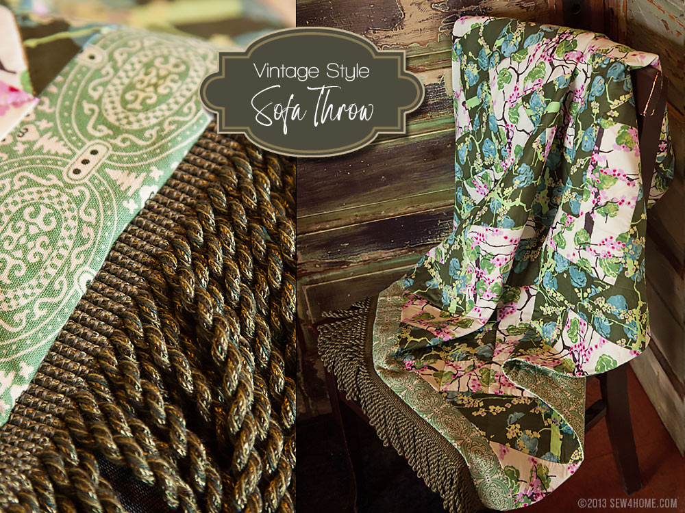 Our Sofa Throw features two unique substrates – voile and linen – in a wonderful zig zag patchwork and with lusciously long bullion fringe at either end. It’s reminiscent of the popular furniture covers of the 1930s and ’40s, which tended to be longer and thinner than what you find today. One or more of these heavy throws adorned the back of a couch or chair in nearly every home of the era as a prominent decorating accent. The combination of colors and textures we selected have a beautifully vintage feel, but with a modern infusion of pattern and design. These fabrics originally came from the Alchemy collection by Amy Butler for FreeSpirit Fabrics.
