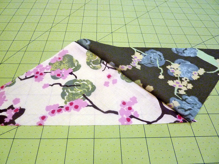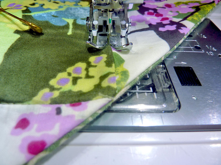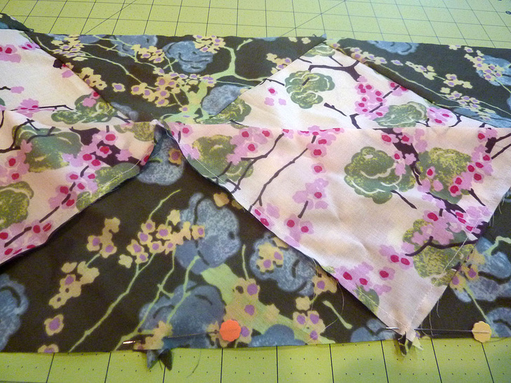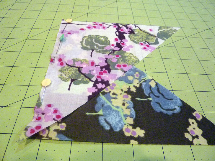 - Pin the triangles right sides together. The tips of the triangles will overlap by ¼”. This is correct and insures that when seamed, the points will be perfectly matched.