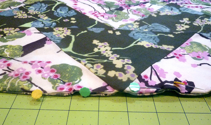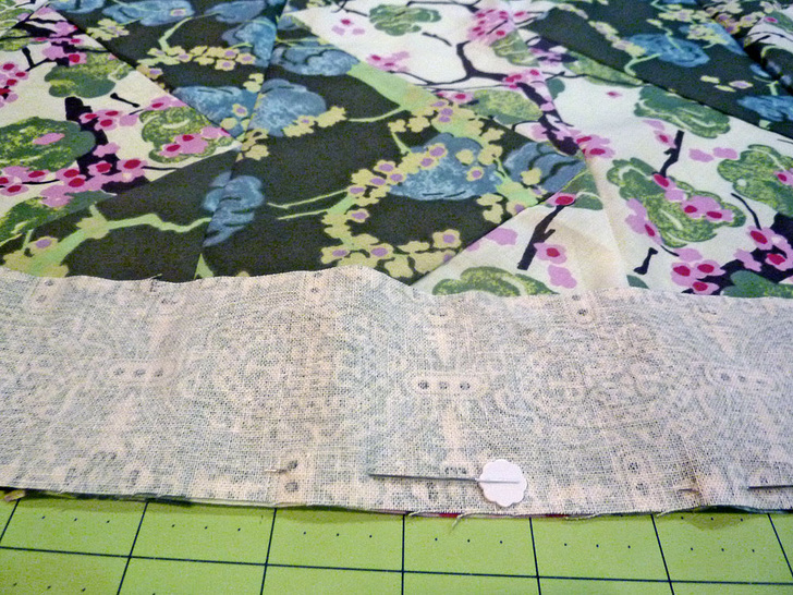 - Unpin the bottom edge of the top/back just enough to allow you room to pin the fringe in place.