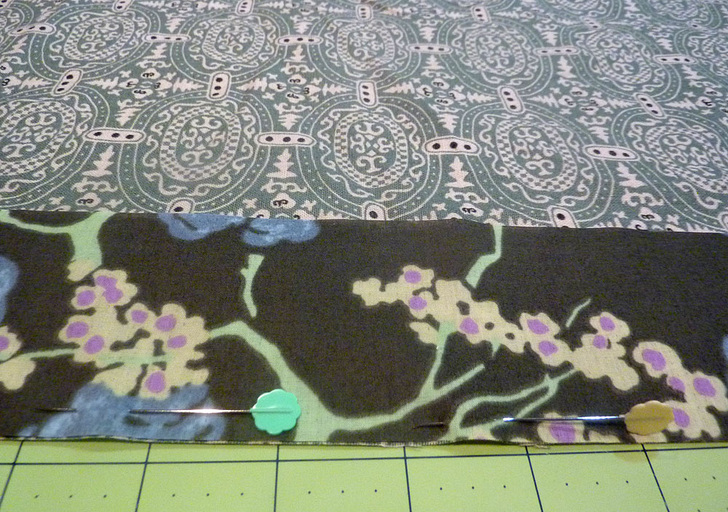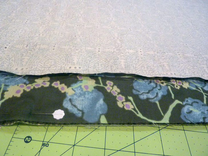 - Place the quilt back right sides together with the quilt top. Align the raw edges all around, being particularly careful to line up the seams of the front and back horizontal accent bands.