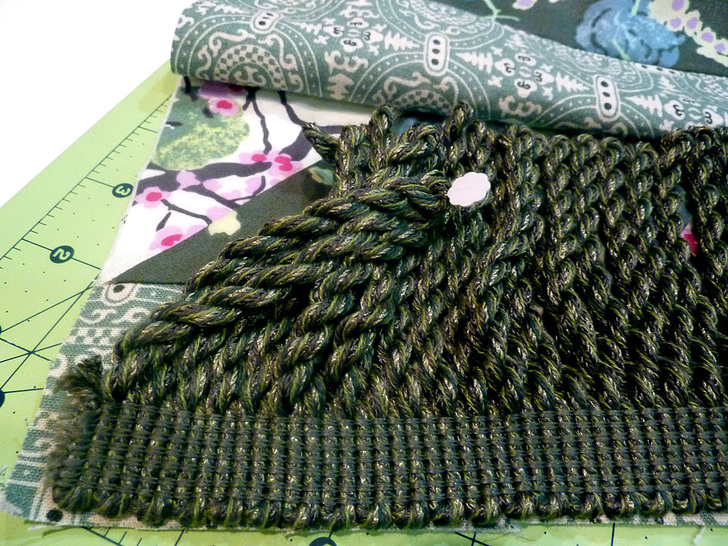 - 2¼ yards of 5-6″ deep bullion fringe; we used a 5½” variegated bullion fringe – deep green with spring green highlights, purchased locally