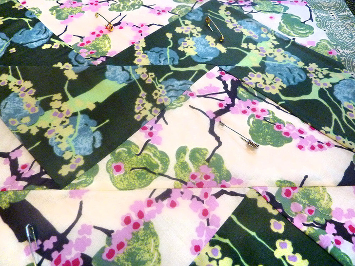 NOTE: We waited to press until we got the entire strip sewn together because the voile tends to stretch, especially as a bias cut triangle. Waiting to press minimizes distortion. - Place the 48 pairs on your work surface in eight rows of six pairs each, making sure the pairs alternate (light, dark, light, dark, etc.).