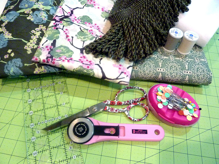 - 1⅝ yards of 54″ wide cotton linen for the back and the front horizontal highlight strips; we originally used Memoir Cotton Linen in Leaf from the Alchemy Studio collection by Amy Butler
