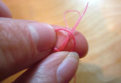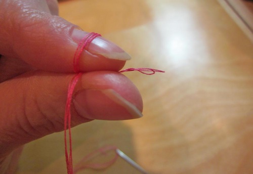 - Knot the thread ends and loop. To make this knot, bring all four strands together between your fingers so you can treat the four as one.