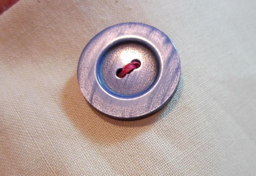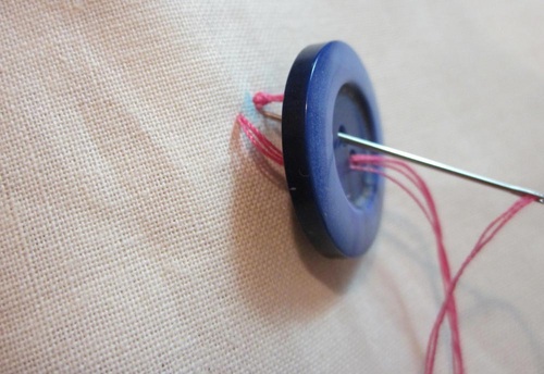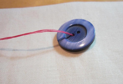 - Sew through the holes on the button twice. Twice around is all you need because your thread is already doubled!