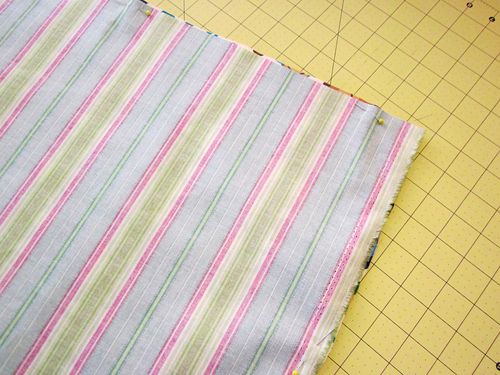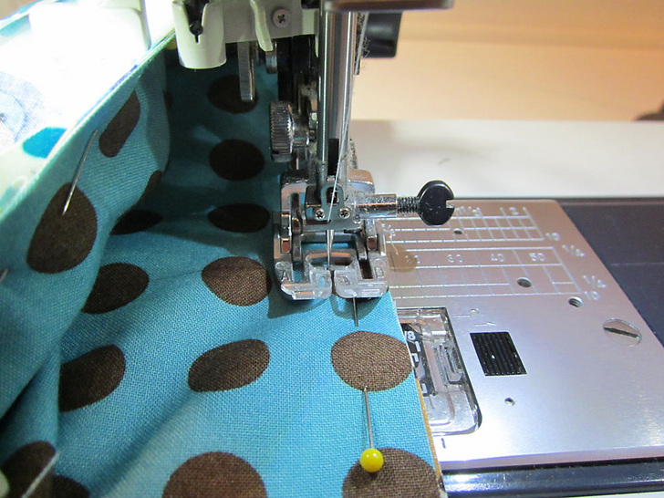 3. Traditionally, it is recommended you use clips not pins to hold laminate layers together. But, if you keep your pins ¼” from the edge and running parallel to the edge of the fabric, any holes left will be in the seam allowance.