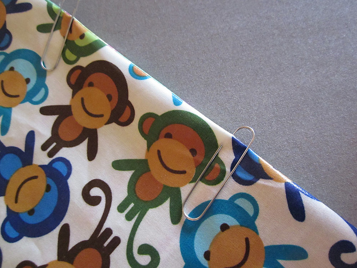 1. Find the two 12″ x 17″ rectangles of laminate. Place them rights sides together, matching all the raw edges. Clip in place along both sides and across the bottom.
