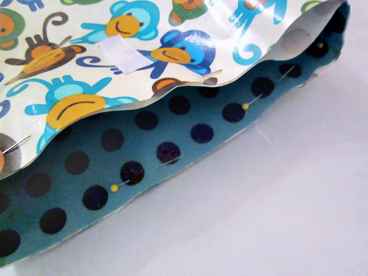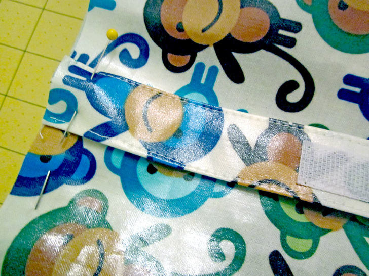 14. Place the loop side (the softer side) of the Velcro® on the right side of the front of the exterior bag. It should be placed 1″ down the top raw edge of the bag and centered side to side. Pin in place.