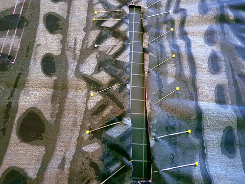 - Using the fabric pen or pencil, extend a drawn line up to the top of the fabric panel and down the bottom of the fabric panel. You need one full vertical line to follow along each zipper window. Place a few pins along the drawn lines to secure the layers.
