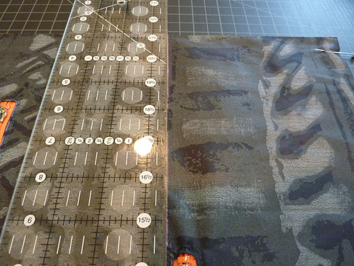 - Using a see-through ruler, align the edge of the ruler with the left stitching line of the zipper window.