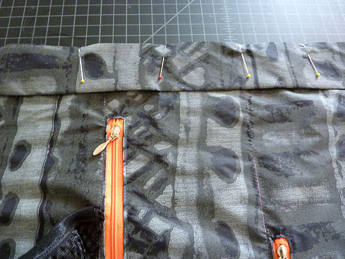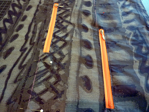 - Find the two zippers. Center a zipper behind each window and re-pin through all the layers.