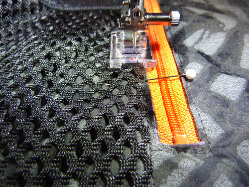 - Re-set the machine for a zig zag and stitch the right edge of the mesh pocket in place from top to bottom.