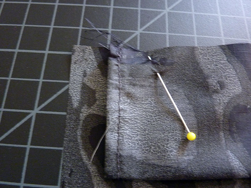 - Lay one 9″ cut edge against the center fold mark of the elastic. Align the edges of the mesh and elastic and pin in place at one end.