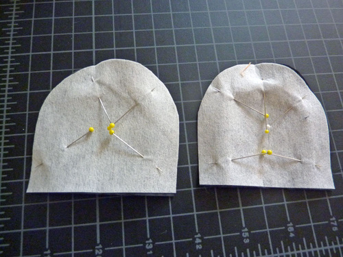 - Place a fused tab right sides together with a plain tab. Pin along the curved edge, leaving the bottom straight edge open.