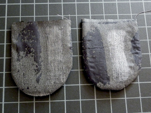 - Following manufacturer’s instructions, and using a pressing cloth to protect the nylon, fuse an interfacing piece to the wrong side of two of the exterior tab pieces.