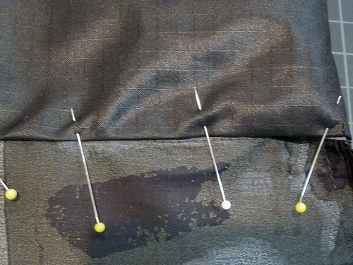 - The top folded edge of the lining should just cover the seam allowance of the casing. If it does not, adjust the top folded edge of the lining until it aligns all the way around. Pin the lining in place.