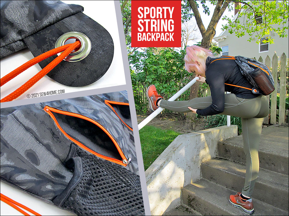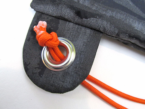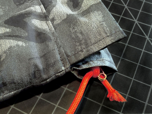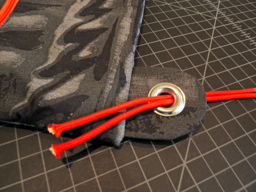 There’s a downloadable pattern for the set-in tabs at the base of the pack, which feature metal grommets to hold the cording strings that form the shoulder straps. By placing the grommets outside of the body of the bag, the inside is roomier and the pack lays flat against your back.