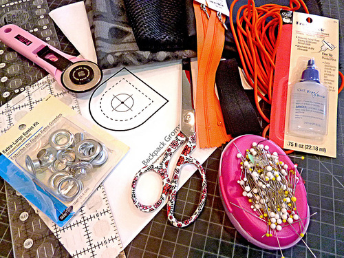 - TWO 7″ plastic zippers to match cording; we used bright orange with decorative metal zipper pulls