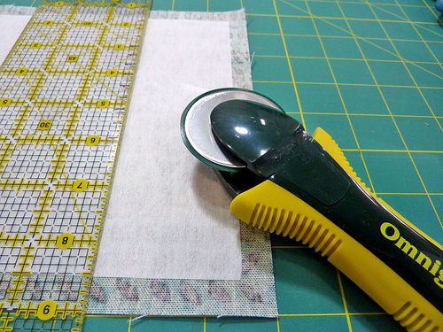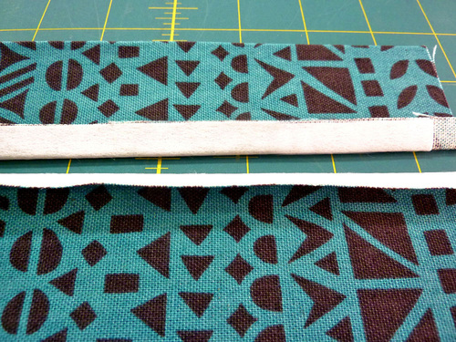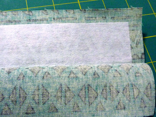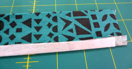 - Find the 4” exterior fabric strip and the 1½” interfacing strip.