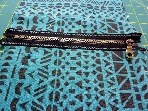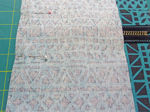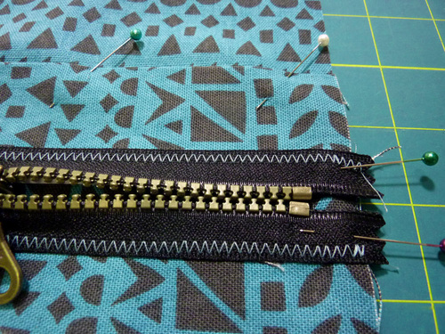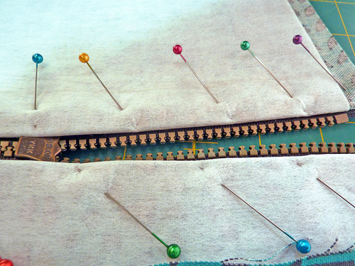 - The zipper sits on top of the right side of the panels, concealing the folded-forward edges. At the back of the zipper, the folded edge should be flush along the zipper teeth. Pin in place from the back.