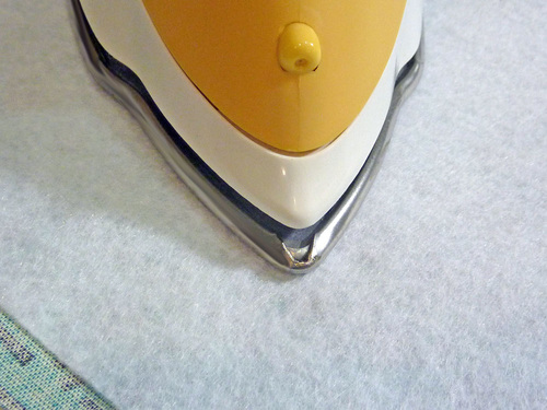- Center the interfacing on the wrong side of one flap panel so there is ½” of fabric showing beyond the interfacing all around. Following manufacturer’s instructions, fuse in place.