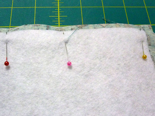 - Find the fusible fleece. Center it on the wrong side of the assembled exterior panel so there is ½” of fabric showing beyond the fleece on all sides. Following manufacturer’s instructions, fuse in place.