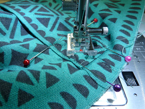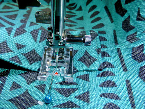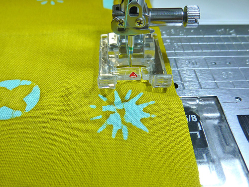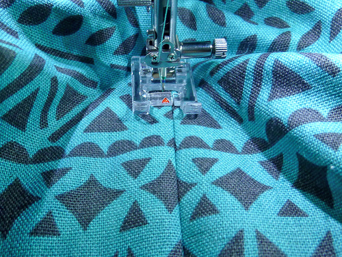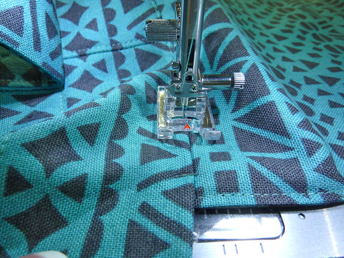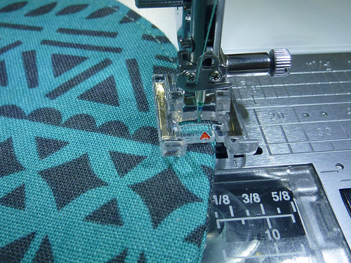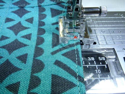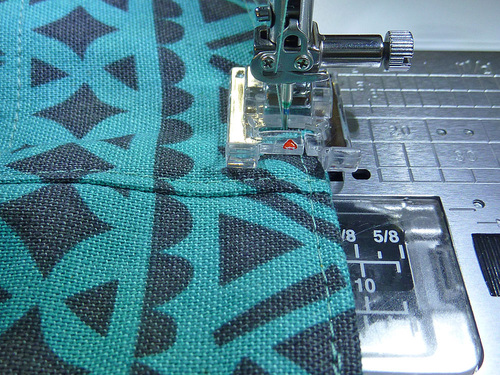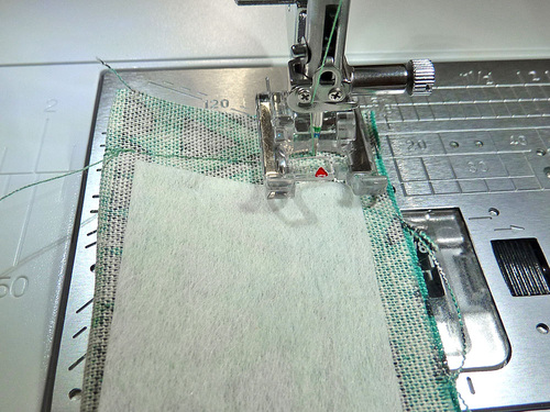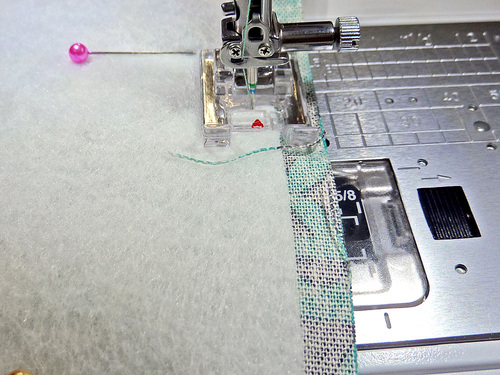 - Re-set to a normal stitch length. Using a ½” seam allowance, stitch in place.