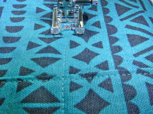 - Slightly lengthen the stitch. Topstitch ⅛” from each seam within the center panel and each back panel (securing those pressed seam allowances in place).