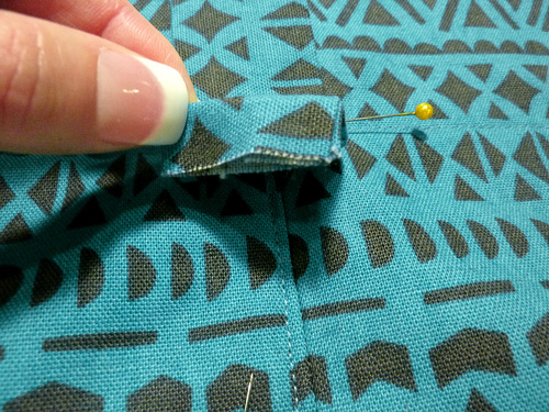 - Place the raw straight edge of the flap against the folded down edge at the back of the bag, right sides together. The flap should be centered across the back, using the bag’s back seam as the center point. Remember, the raw edge of the flap should be flush with the folded down raw edge of the bag. Pin in place.