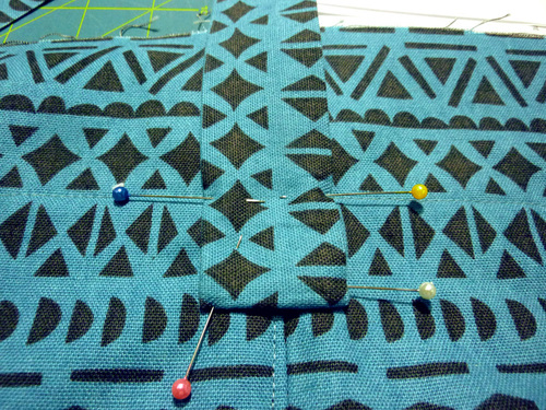 - Place the center panel, right sides together along the inner edge of one pocket panel. Pin in place.