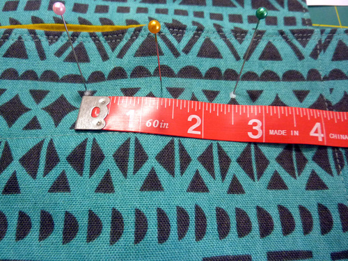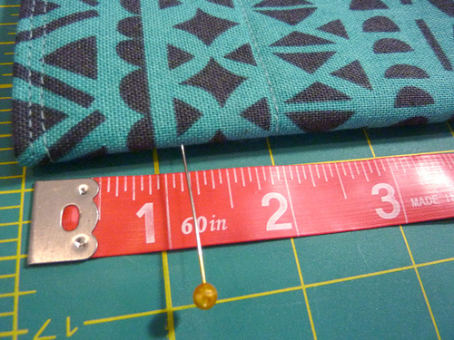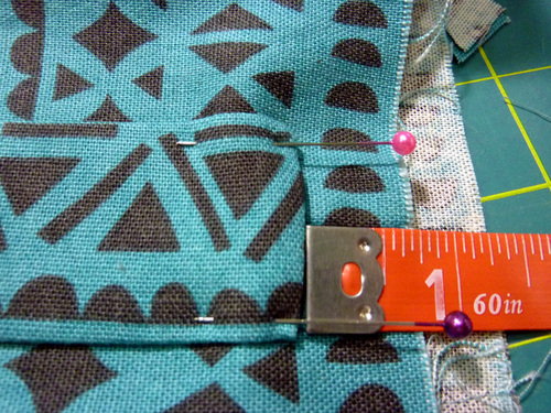 - Fold the bag in half to find the exact center front. Measure ¾” up from the faux facing seam and mark this point with a pin. This will be the center line on which all the grommets will be placed.