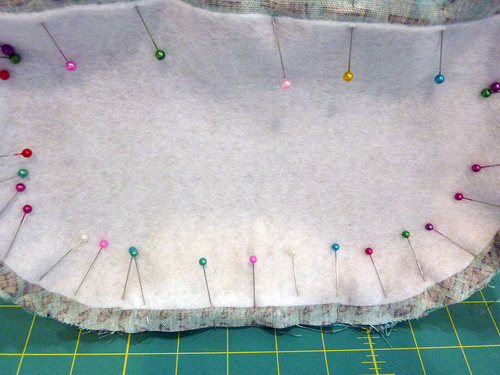 - Re-set the stitch length to normal. Using a ½” seam allowance, stitch all the way around the base. Go slowly, holding the layers flat with your fingers if necessary to avoid any puckers.