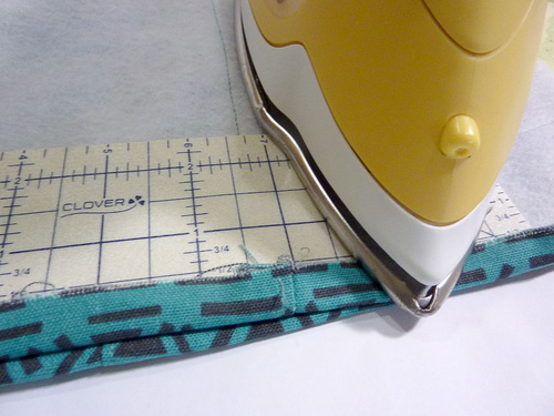 - On the large bottom section, fold the upper edge forward ½” and press well. This means the two folded edges to either side of the zipper opening are folded back so the wrong side is showing.