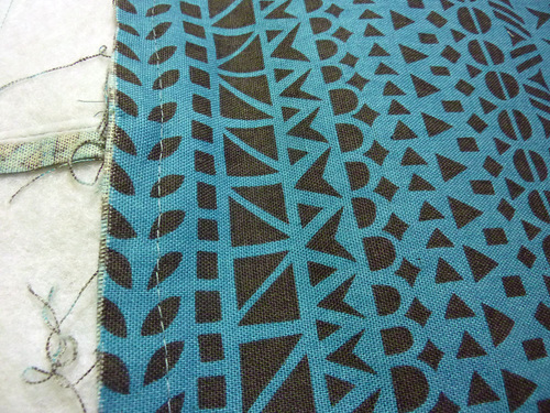 - Here’s the same view from the inside. The flap is extending to the right and the basted layers are facing down toward the inside of the bag.