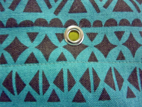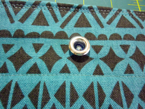 - Insert a grommet at each marked point, following manufacturer’s instructions or our own great tutorial (How To Insert Metal Grommets).